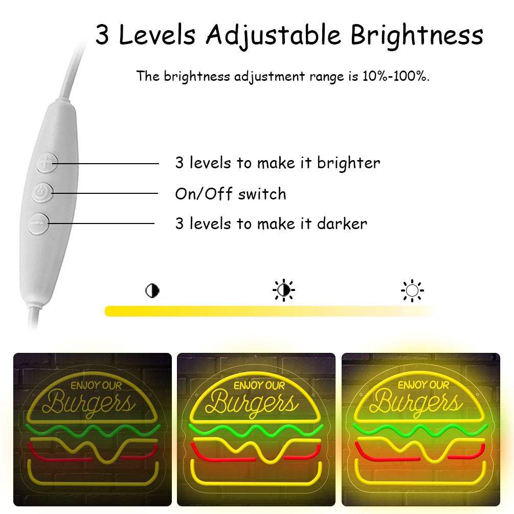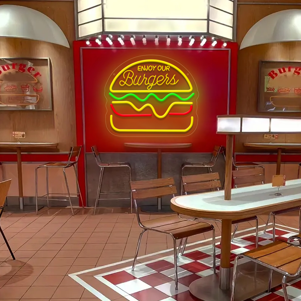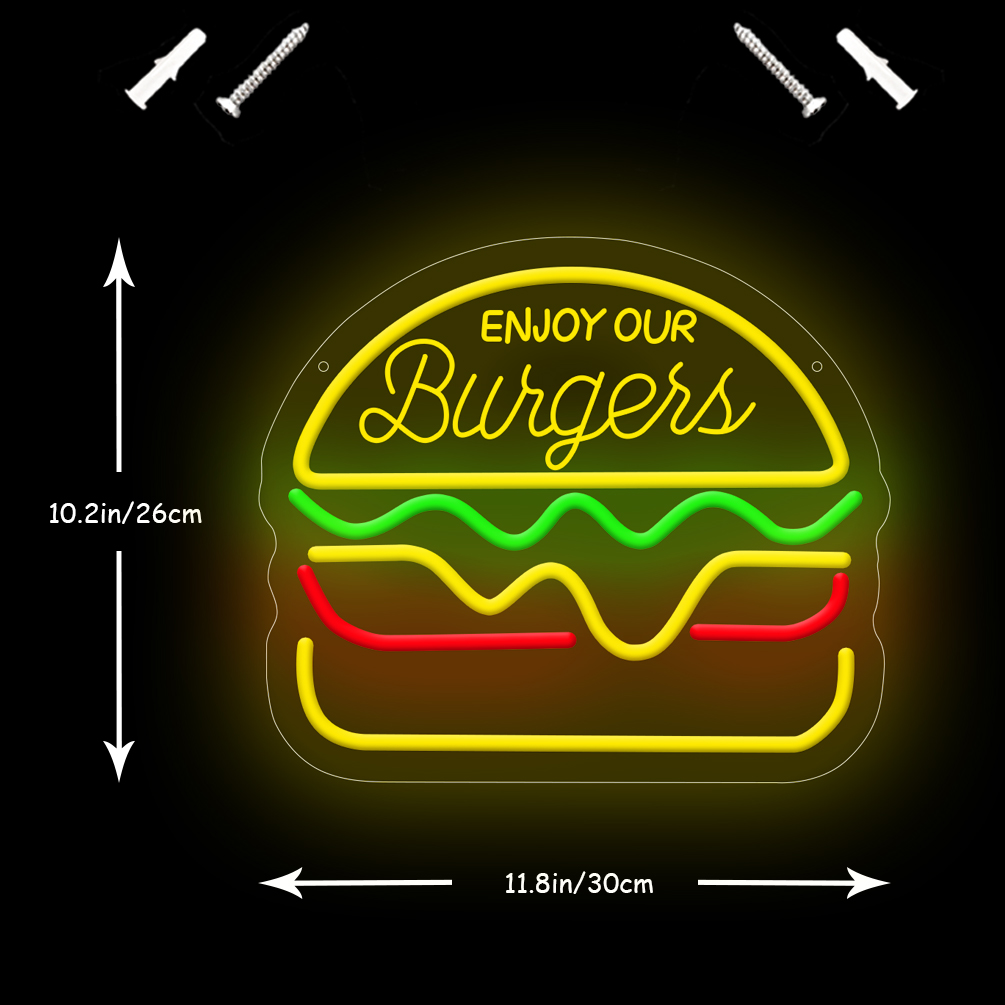 1 pc Enjoy Our Burgers LED neon sign, 3D engraved ambient wall decoration neon sign for restaurants, shops, fried chicken shops, burger joints, fast food shops, parties, offices, game rooms, homes, clubs, living rooms, bars, bedrooms and home wall decorations, preferred choice for friends and family’s birthday and holiday gifts, USB powered illuminated sign hanging device. 5V USB Power Supply