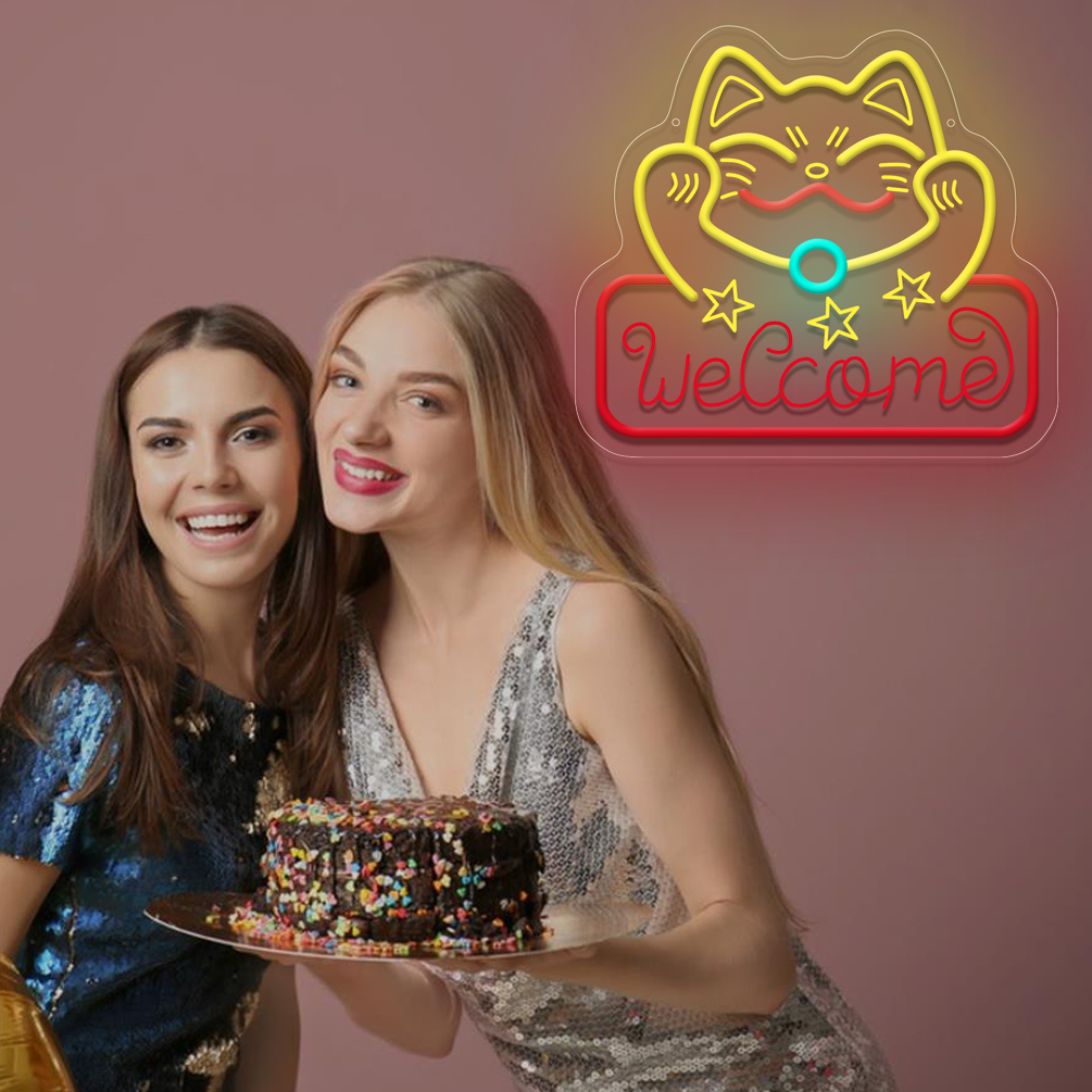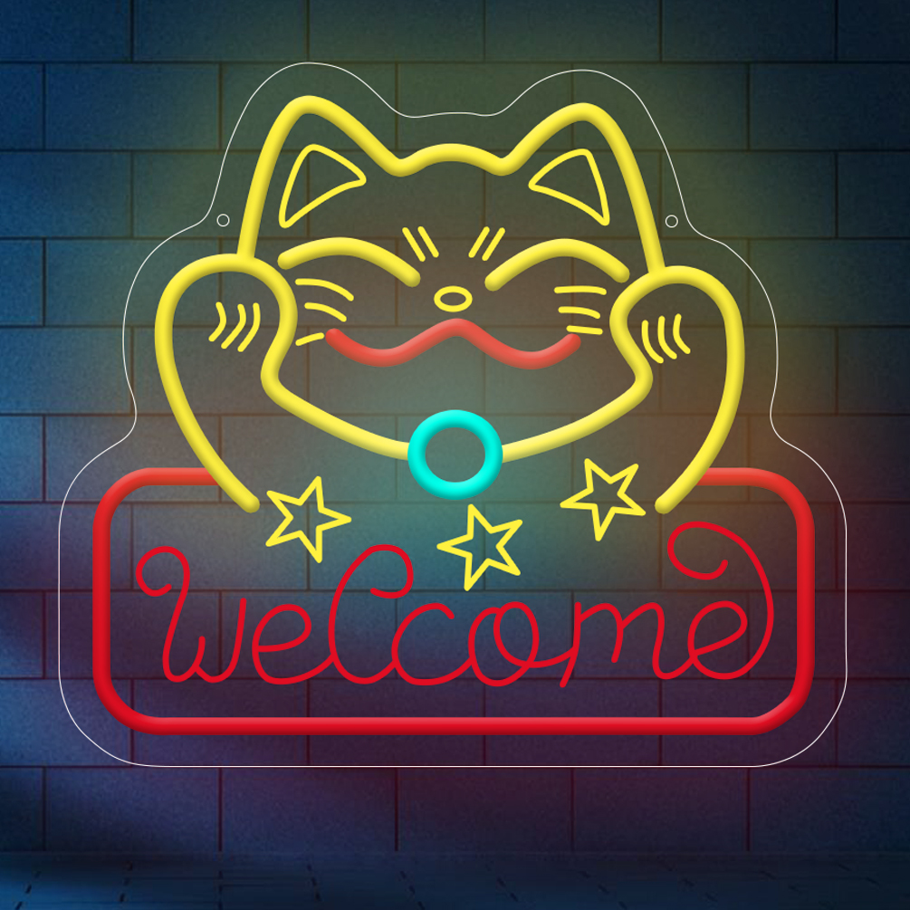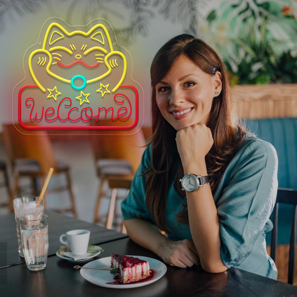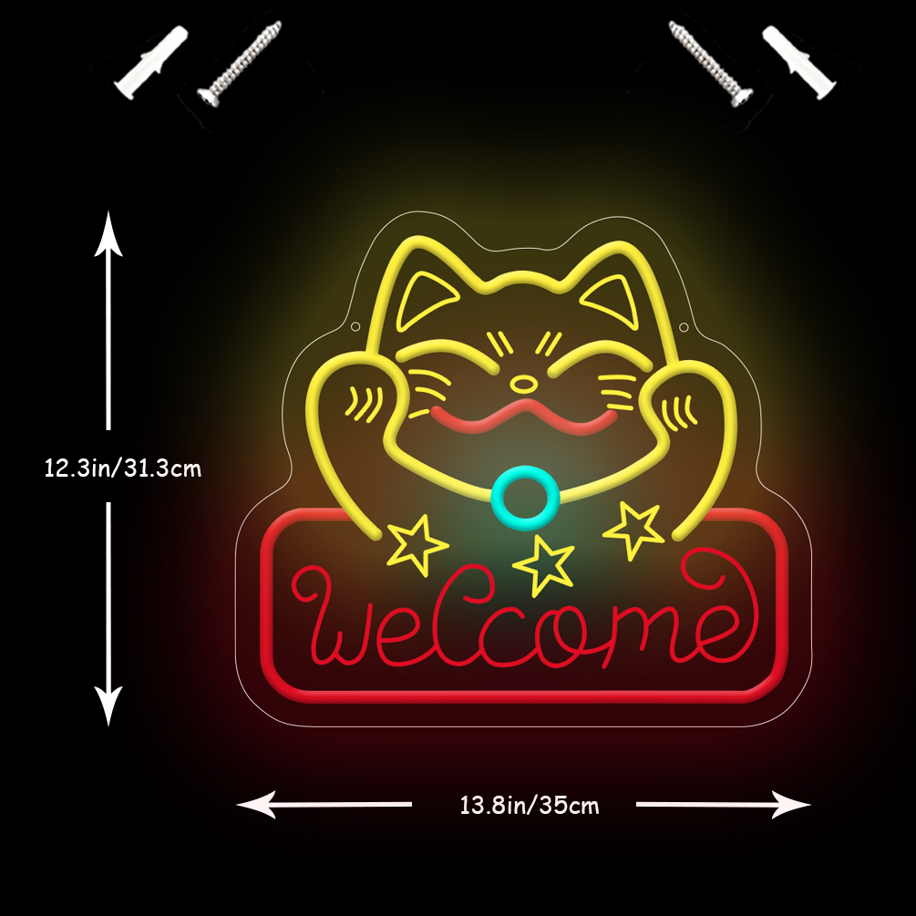1 pc fortune cat welcome LED neon sign, 3D engraved ambient wall decoration neon sign for shops, pet shops, parties, offices, game rooms, homes, clubs, living rooms, bars, bedrooms and home wall decorations, preferred as birthday and holiday gifts for friends and family, USB powered illuminated sign hanging device, 5V USB power supply