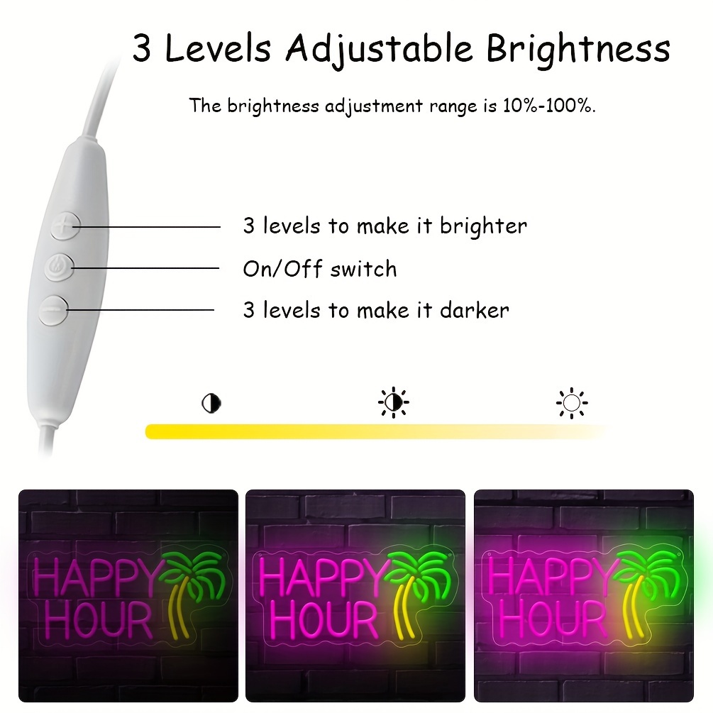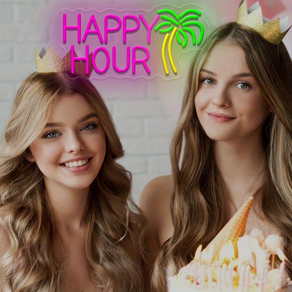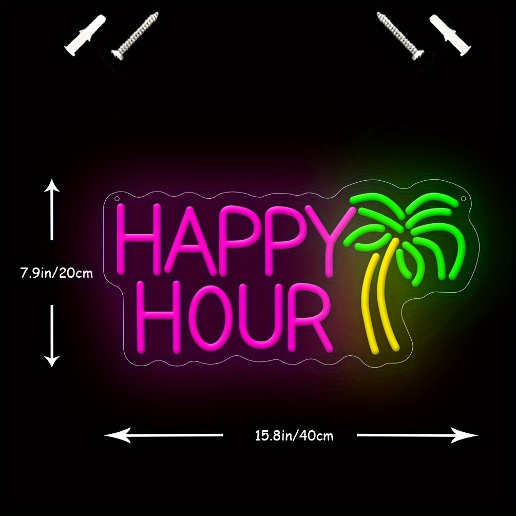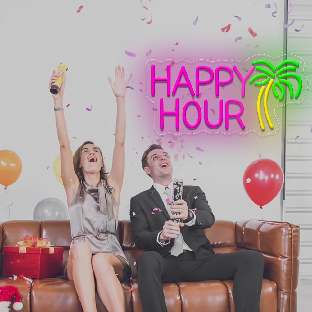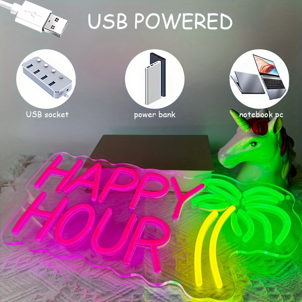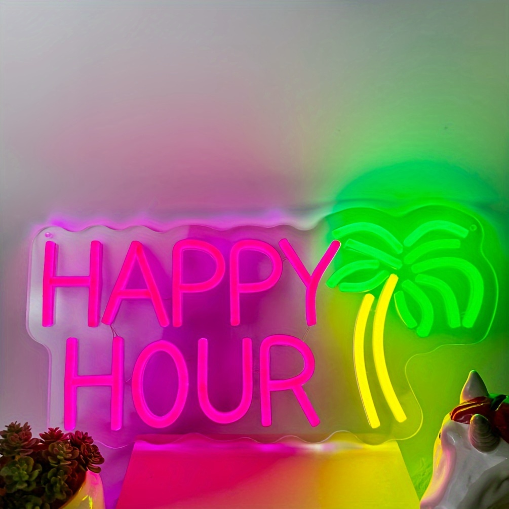 1 pc Happy Hour Neon LED Sign, Wall Decoration Coconut Palm Tree Rose Red Letter Neon Sign, Great for parties, clubs, coffee shops, hotels, bedrooms, pubs, shops, rooms, friend gatherings, game room wall decorations, 5V USB Power Supply
