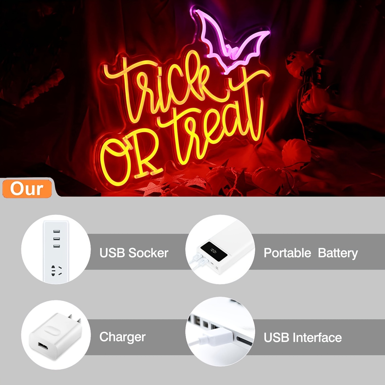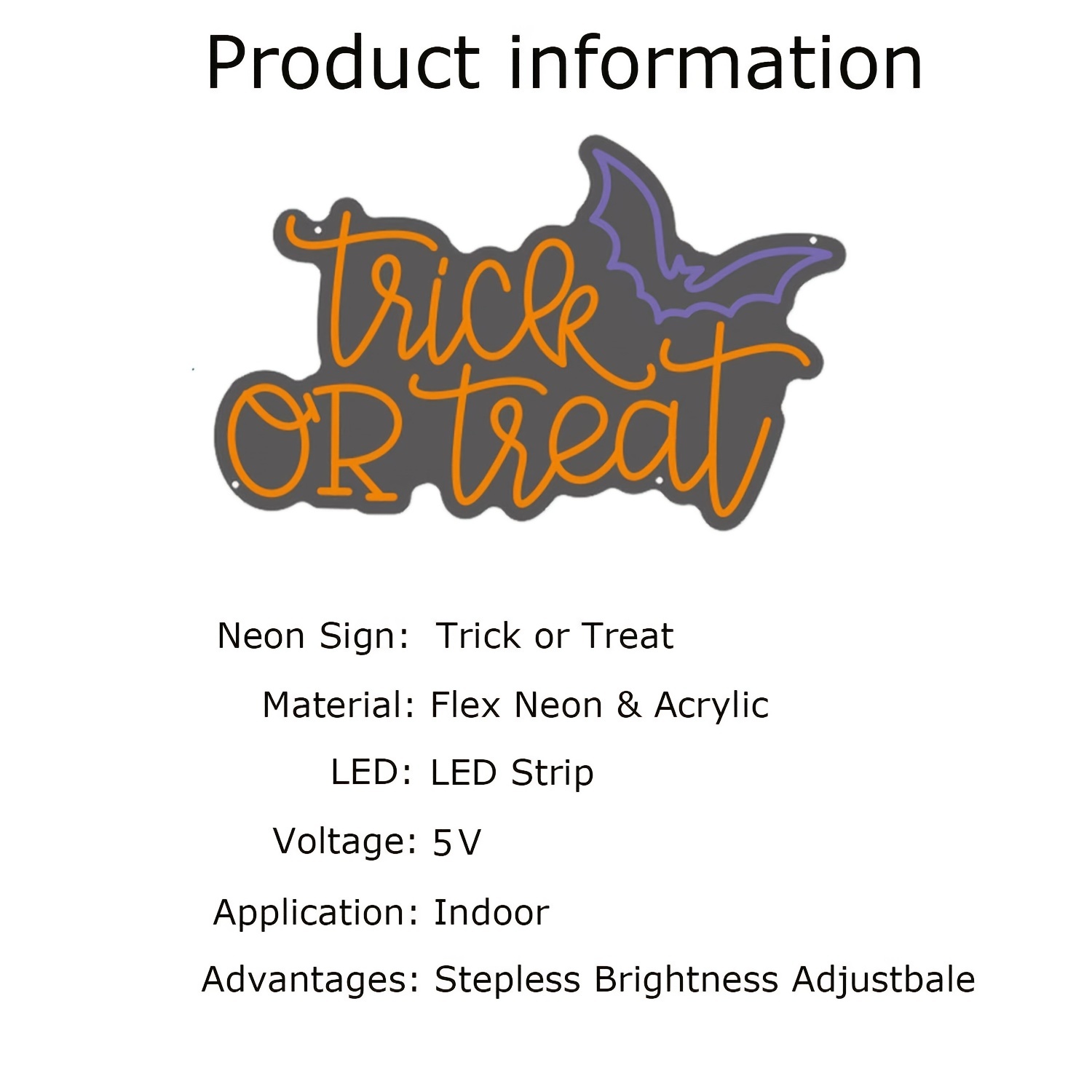 1 pc Trick or Treat Halloween Wall Neon Decoration, Dimmable LED Halloween Ambiance Wall Decoration Neon Sign, great for Halloween parties, bedrooms, birthday parties, pubs, shops, rooms, friends party wall decorations, as a friend’s family birthday, Halloween gift preferred, USB powered light up sign hanging device, 5V USB power supply