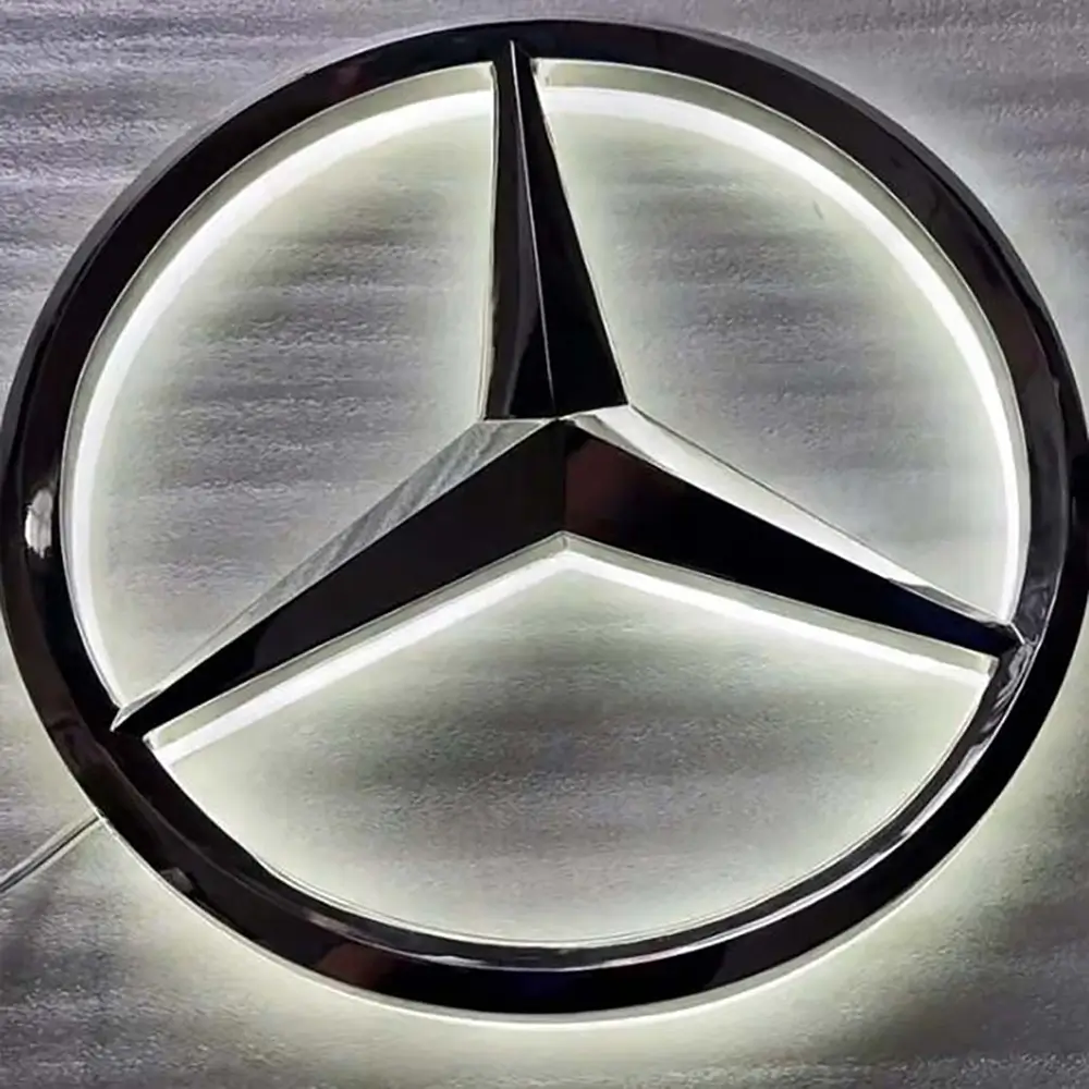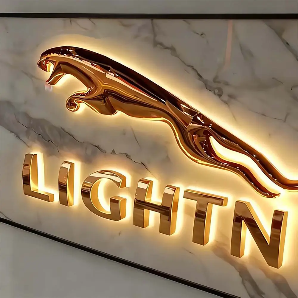 Custom options include embossing depth, metal type, surface finish, LED color, size, thickness, and mounting system. These custom 3D embossed metal backlit letters are suitable for corporate signage, luxury branding, exterior facades, and architectural signage projects.