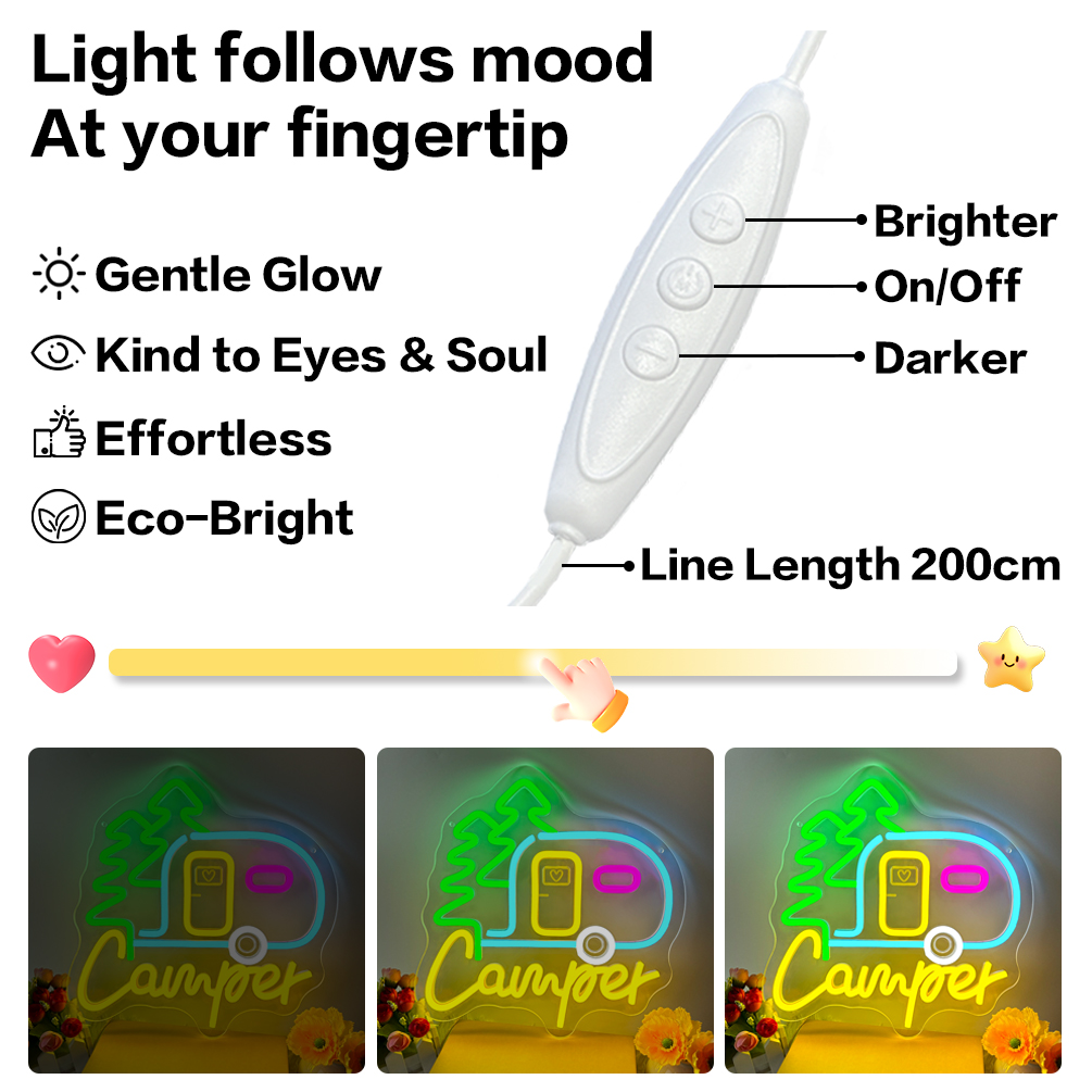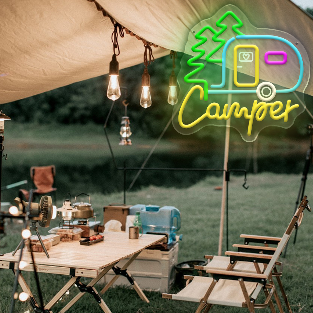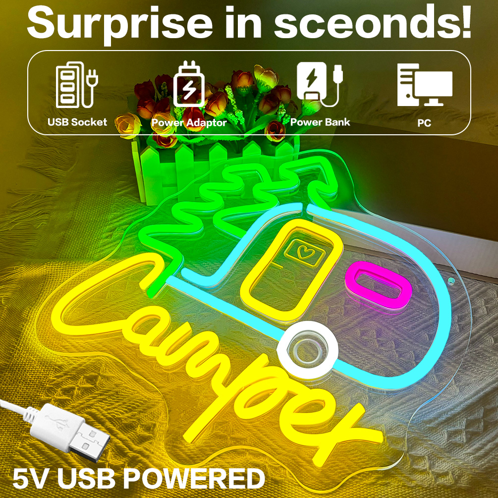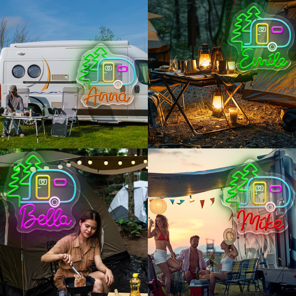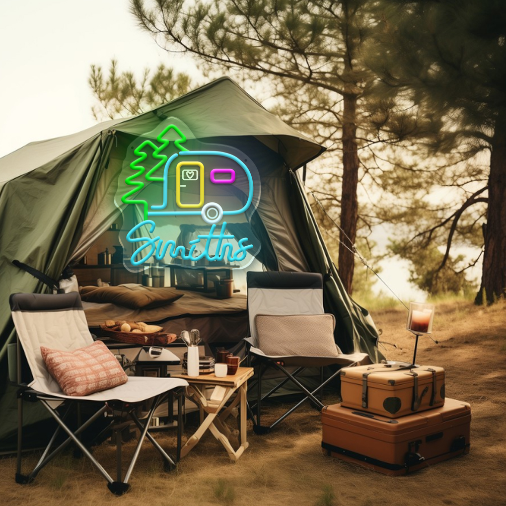 Custom camping signs and name neon lights, personalised LED neon lights for theme parties, caravans, camping, gifts, campsites and home decor, ideal unique gifts for camping hobbies, birthday gifts, housewarming and more.