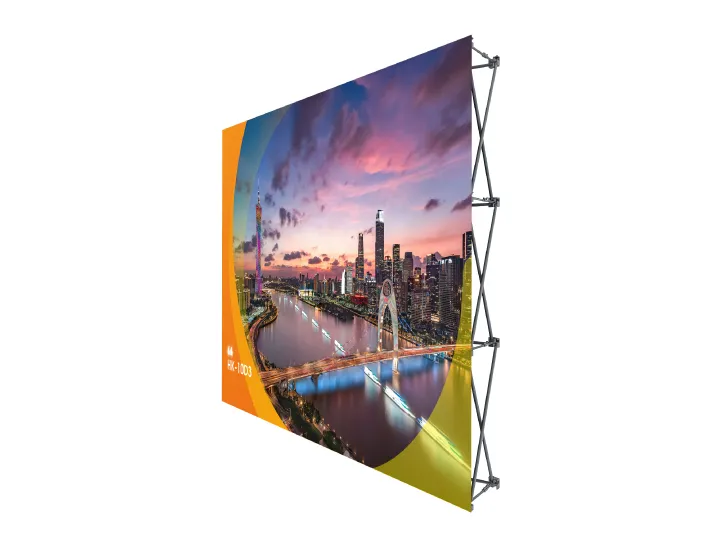 The Curved pop up display system offers a cost-effective and portable solution for various event marketing needs. It comprises a Pop-Up style frame adorned with a vibrant full-color dye sublimated graphic. The imported dye sublimation printers and ink ensure that the graphics are water-washable and resistant to fading. With only a single piece of tension fabric for the entire print, there is no need for joints like in PVC printing. The graphic remains attached for effortless setup and takedown but can be easily replaced for different marketing events.