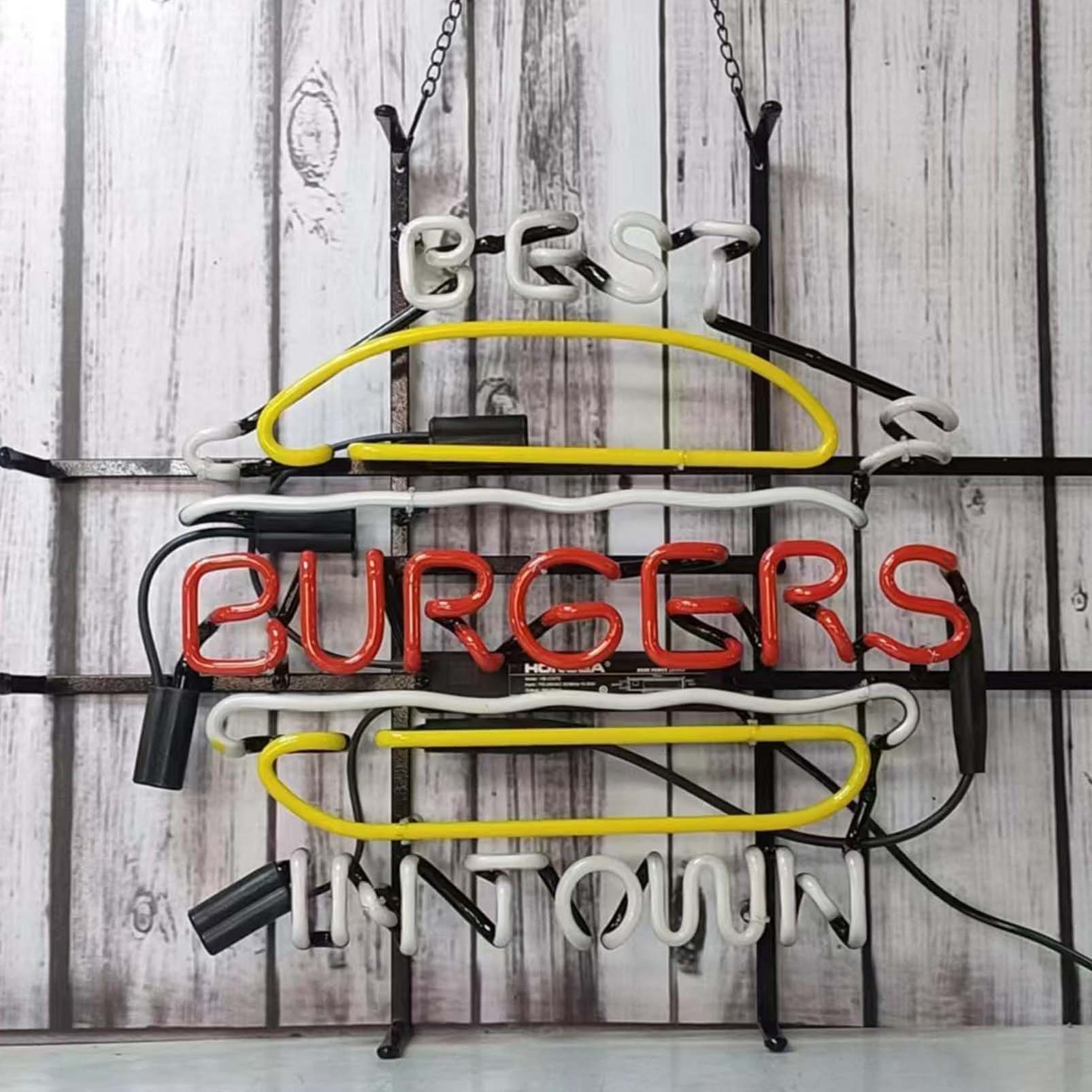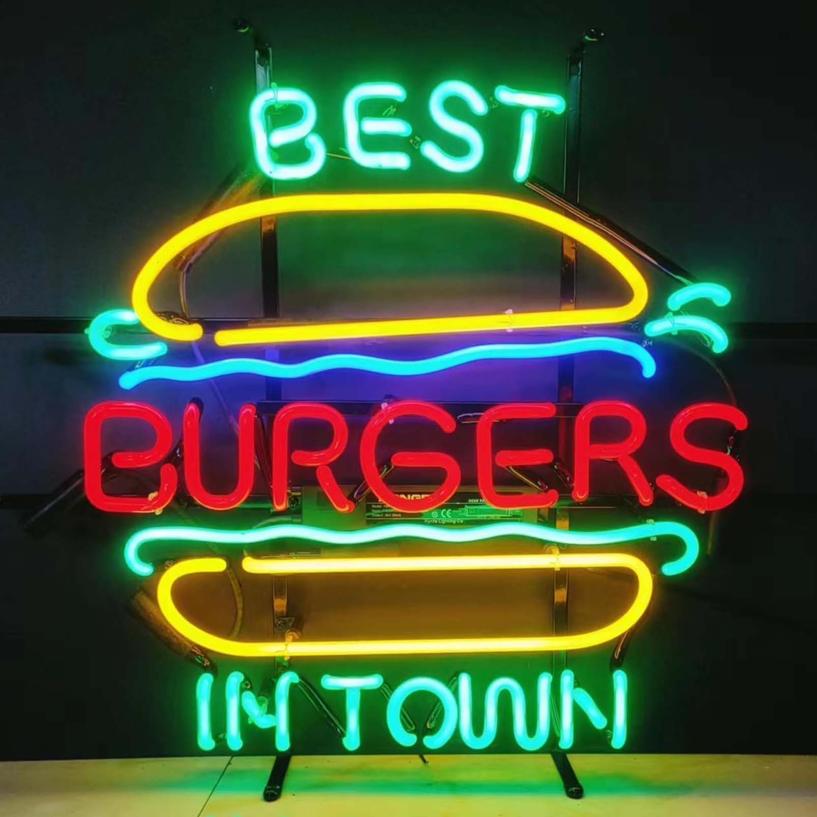 High quality super bright Best Burgers In Town sign, large glowing glass tube neon LED sign for office, parties, coffee shops, bars, birthdays, men’s caves, home and event wall art decor.