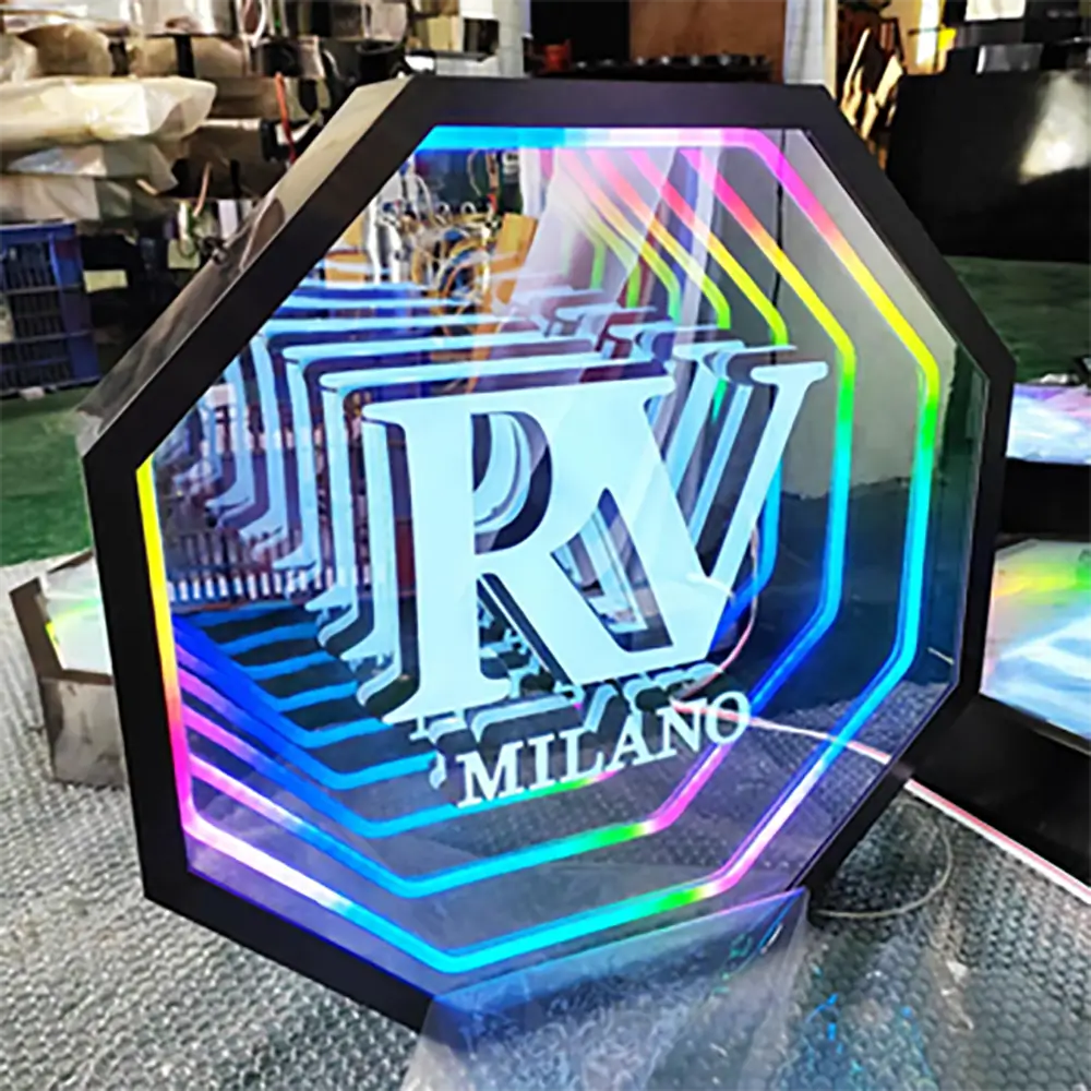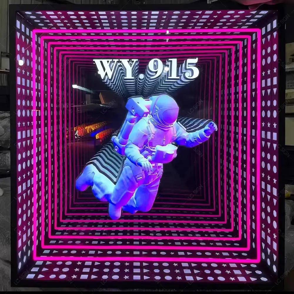 Custom options include mirror type, depth effect, LED color, size, and frame structure. These custom infinity mirror light boxes are widely used in decorative installations, retail displays, exhibition projects, and creative branding environments.