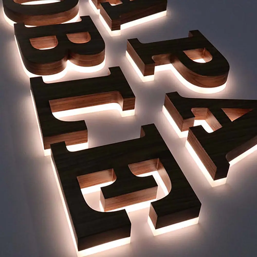 Wood Backlit Letters combine natural wood materials with concealed LED halo lighting, creating a soft and warm backlit effect with natural texture. The structure integrates CNC-cut wood panels with internal lighting components, suitable for interior signage and decorative branding environments.